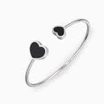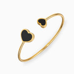 Crafted with a polished gold-tone finish and two opposing black enamel hearts, this open-style bracelet offers effortless elegance. Whether worn solo or stacked with other bangles, it's a standout piece for any occasion.